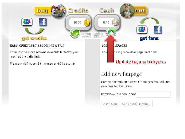En son adım olarak facebook sayfaları beğendiğiniz için puanlarınızın hesabınıza yansıtılması ve yeni facebook sayfaların eklenmesi için Update tıklayın.Aşağıdaki resimde olduğu gibi.