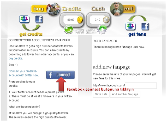 Fanslave hesabınıza giriş yaptığınızda karşınıza aşağıdaki gibi ekran görüntüsü çıkacaktır.Bu alandafacebook connect yazan butona tıklıyorsunuz.Aşağıdaki resimdeki gibi.